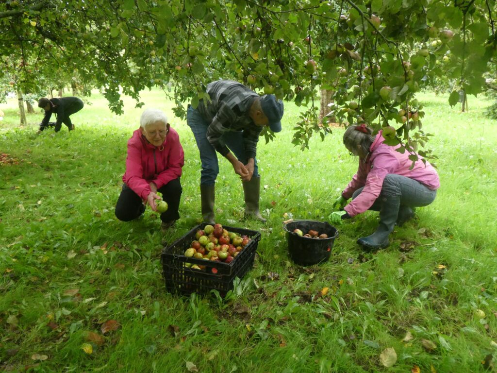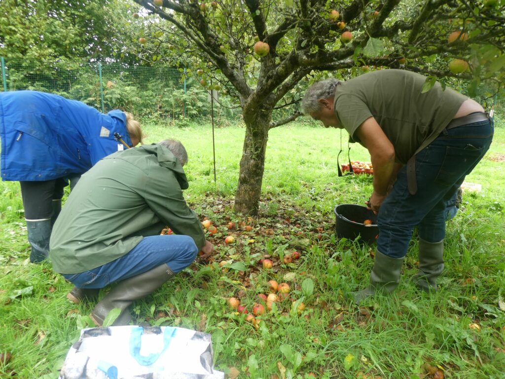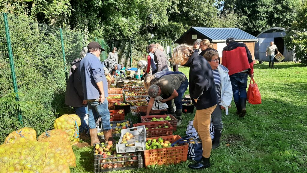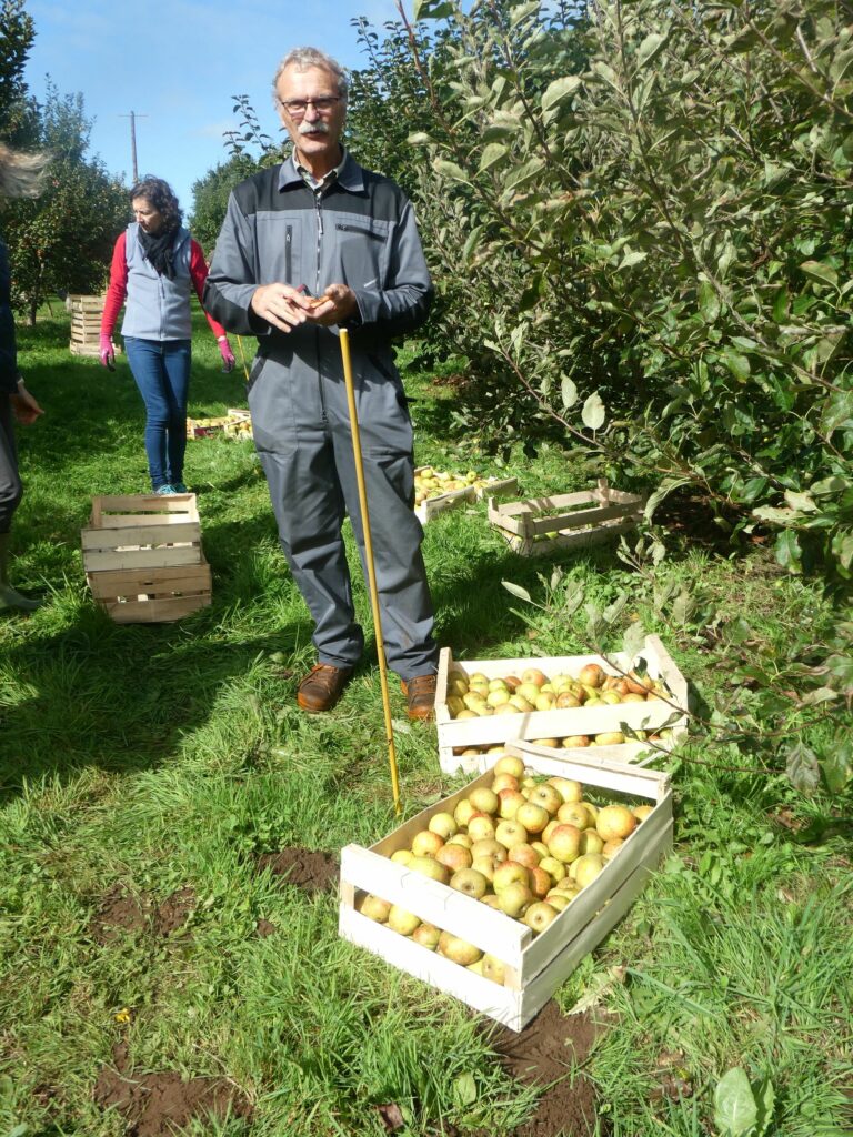 Lors de l’activité les adhérents ont ramassé les pommes pourries, c’est important de ne pas les laisser, cela évite la transmission des maladies. Dans un deuxième temps les pommes tombées ont été recueillies et entreposées dans des cageots puis distribuées afin d’être utilisées rapidement, souvent meurtries elles ne se conservent pas très longtemps.
