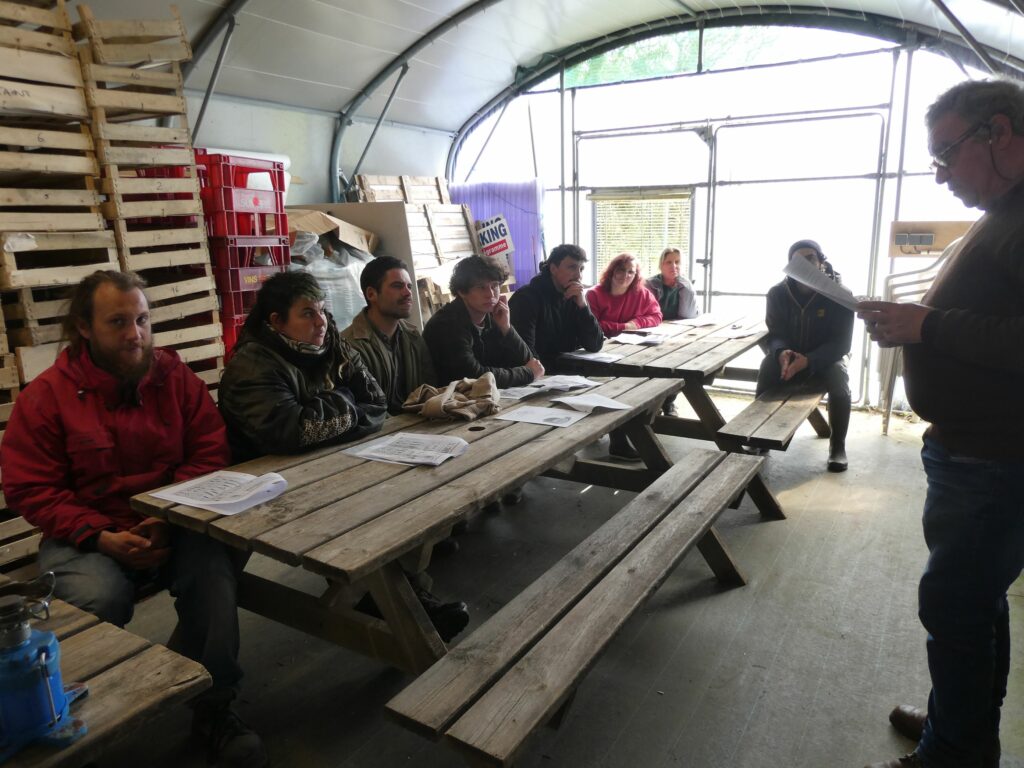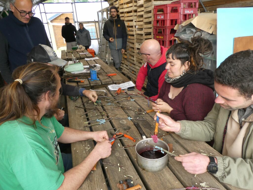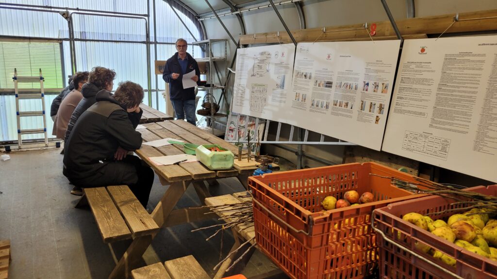 Les débutants ont reçu des explications plus détaillées sur les techniques de taille (reconnaissance des organes de l’arbre fruitier, la taille de formation, la taille trigemme) avec démonstration sur une charpentière. Nous avons parcouru le verger en commençant par la pépinière en finalisant la taille de formation des jeunes arbres.