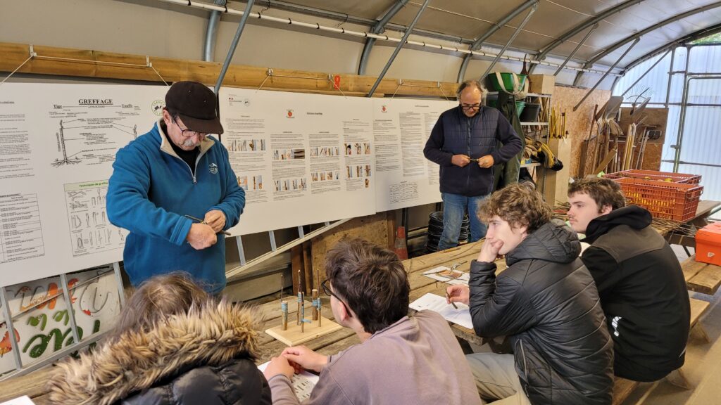 Nous avons montré l’évolution d’une greffe en couronne qui fera l’objet de la prochaine activité. Les arbres de la zone palissée ont été taillés et soignés. Il est important de réaliser la taille trigemme sur ces arbres afin qu’ils gardent leur structure d’origine (Double U, Palmette horizontale, cordon …)Tous les arbres du verger ont été taillés, une pulvérisation de bouillie bordelaise a été pratiquée sur les jeunes arbres du verger, les plants palissés et les jeunes fruitiers en pépinière.