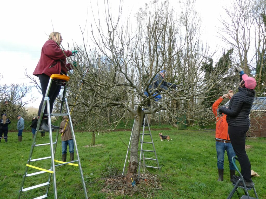 Lors de cette séance de nombreux arbres de grande taille ont été taillés par les adhérents assez nombreux. Désormais la plupart d’entre eux maîtrisent mieux la taille. Ils sont donc beaucoup plus efficaces et plus autonomes et sont ravis des renseignements et conseils fournis pour les appliquer chez eux et pratiquer la taille dans leurs propres vergers. Pour la séance du 29 mars, il reste encore quelques grands pommiers à tailler. Une pulvérisation de bouillie bordelaise sera effectuée sur les jeunes plants en prévention d’apparition de chancre.