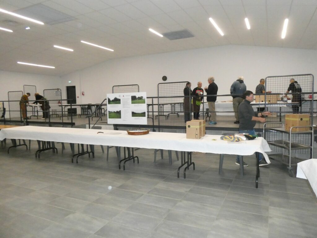 Le dimanche ouverture de la salle à 7h et les premiers bénévoles ont pu commencer par la disposition des tables, des nappes et des grilles d’exposition. Les panneaux indicateurs sont mis en place pour diriger les visiteurs vers la salle Marcel Bouguen. Le plan de salle préalablement établi permet la mise en place de l’exposition de pommes, des stands exposants et de la zone de restauration. Les pommes d’exposition sont disposées dans les assiettes étiquetées par lot de fournisseurs. Les différents exposants se sont installés dans leur stand au fur et à mesure de leur arrivée. Le système de présentation des vidéos est installé près de l’entrée.