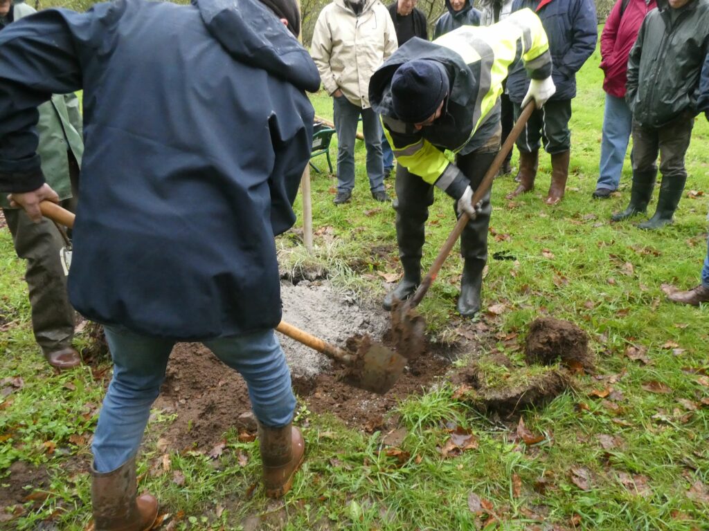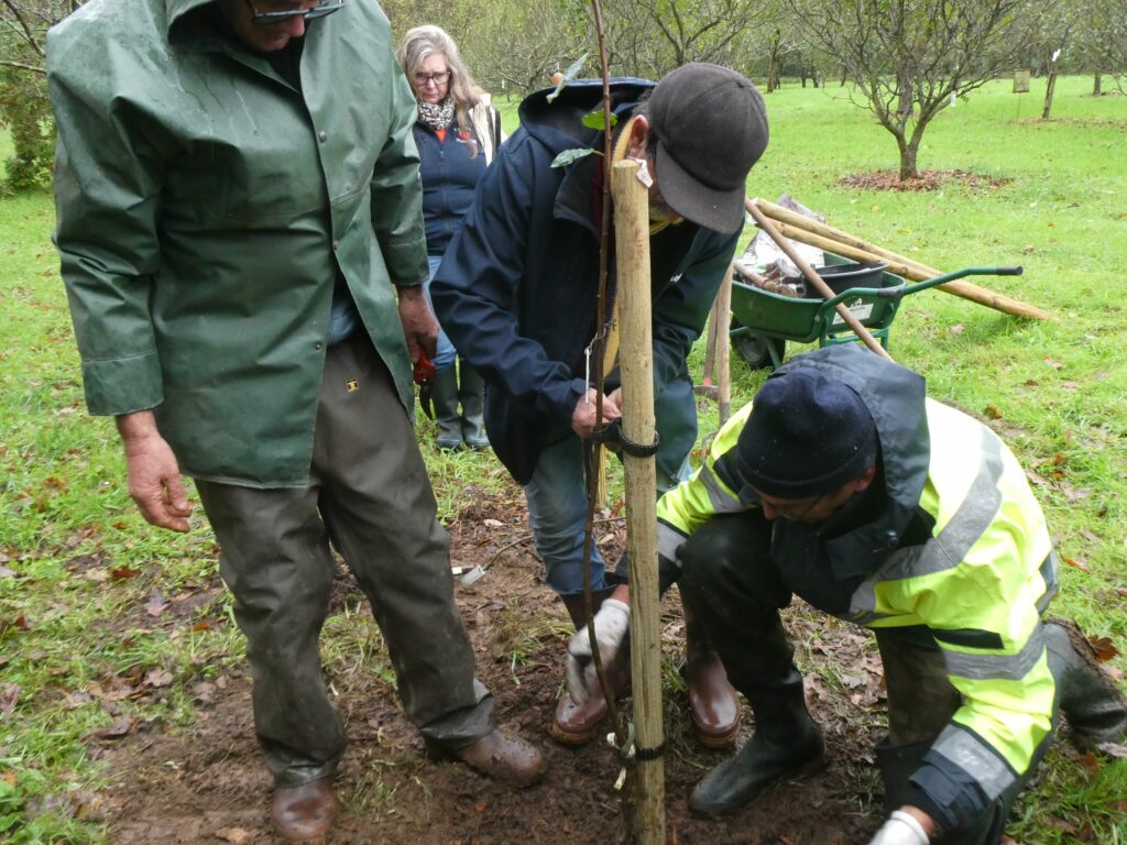 30 personnes se sont retrouvées au verger de Locmaria pour l’activité analyse de sol et plantation par une météo maussade et pluvieuse en début d’activité.