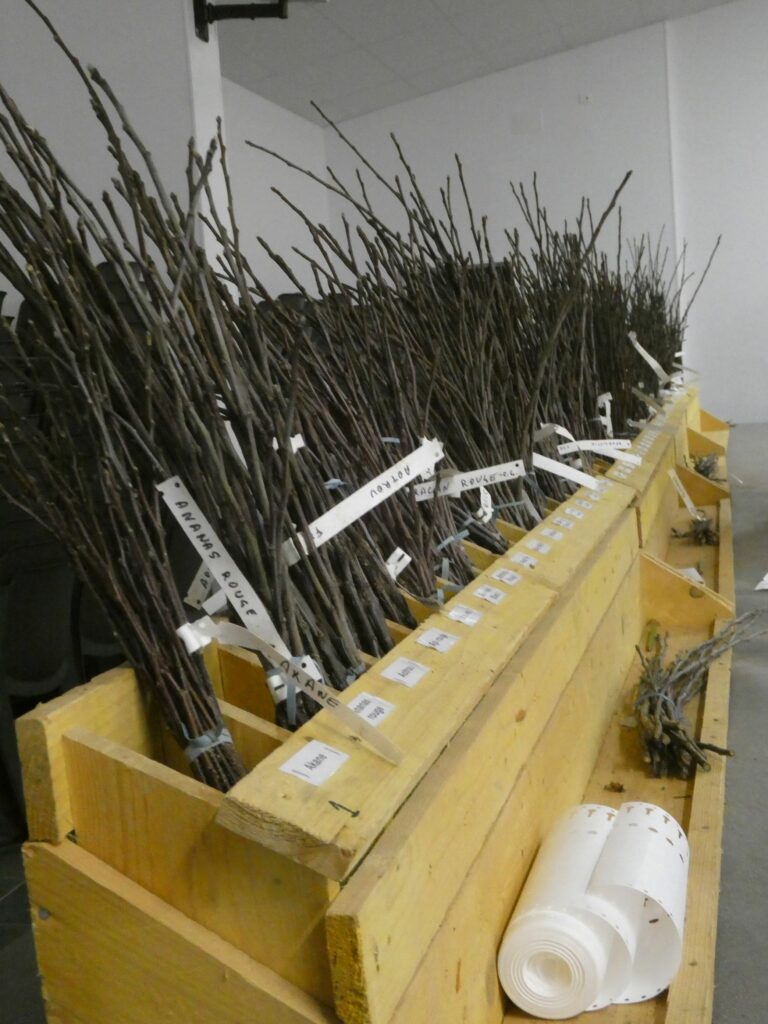 Lundi 16 février les 60 échantillons de pommes tardives à présenter à la foire aux greffons sont préparés.