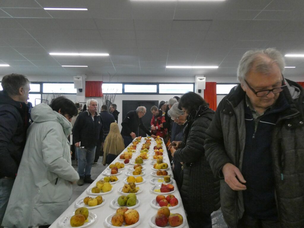 Avant de choisir les variétés, les visiteurs peuvent découvrir l’exposition de pommes tardives, encore bien conservées et peuvent goûter certaines variétés. Les listes de greffons affichées par ordre alphabétique et par précocité renseignent les visiteurs.